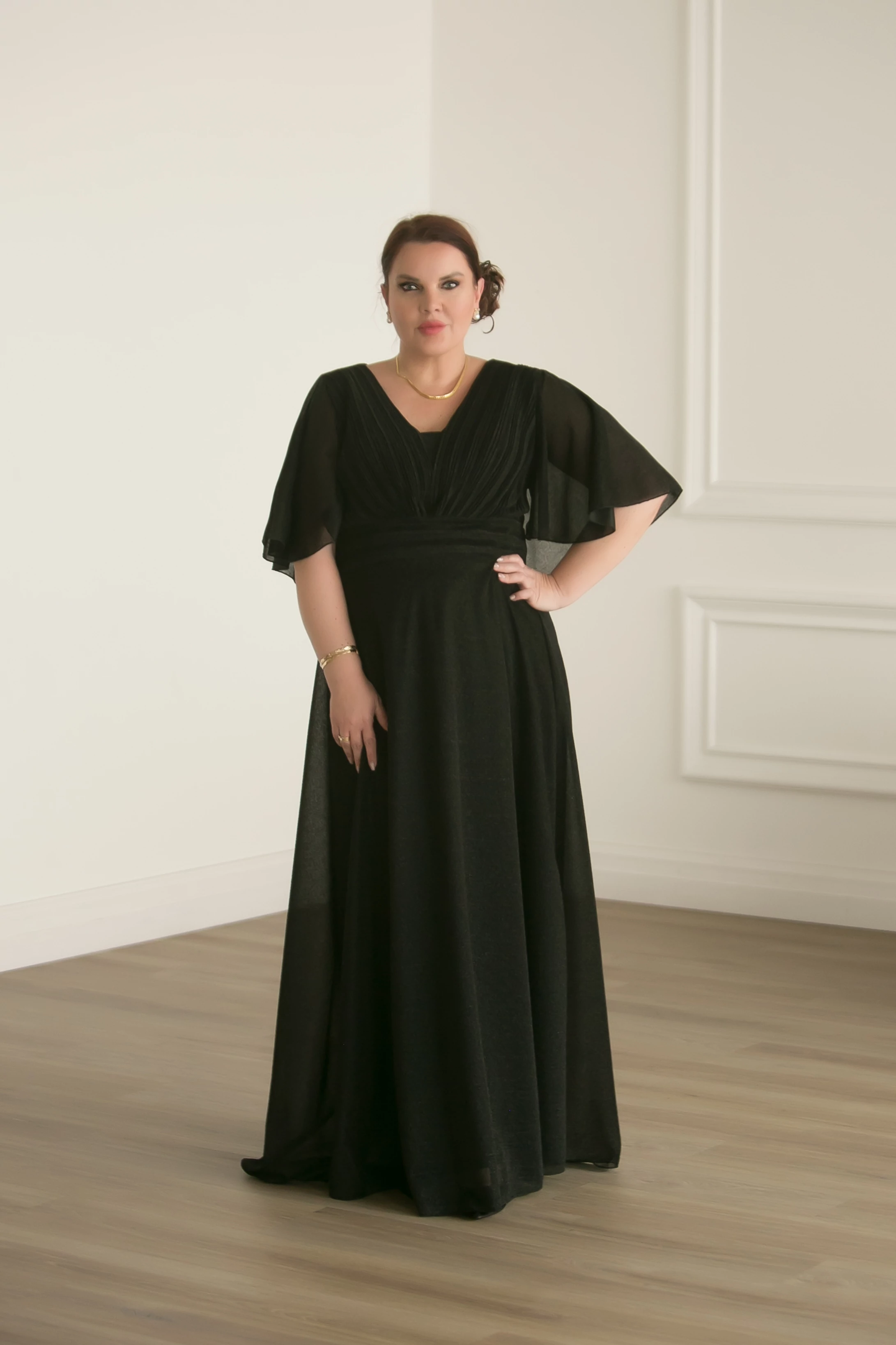 120-as mellbőségig, derékbőségig és 125cm-es csípőbőségig bátran ajánlom. Összességében 44-46-os méretre lesz jó, mellben 110cm a MINIMUM, amire vigyétek. Csodás esésű, dupla anyagú, szépen ívelt, derekán kötővel, aminek semmi haszna, de szép. |