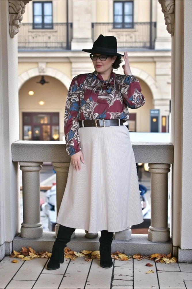 Mellnél 120cm az anyag, a blúz hossza 62 cm. Gumival szűkített ujj, csinos, masnira köthető nyakmegoldás, pompás színösszeállítás... minden adott, hogy nagy kedvenc legyen. 100% műselyem, 42-44-es és 46-os méretre ajánlom, a biztonság kedvéért 118-es mellbőségig. |